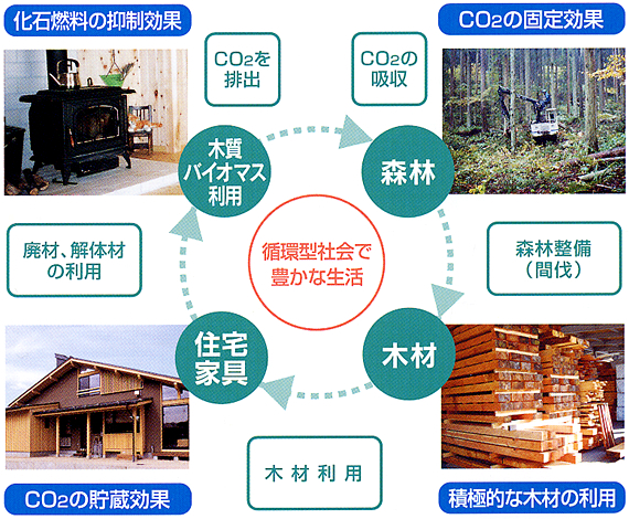 さらに、運搬などに莫大な化石エネルギーが消費される輸入材の使用量を抑え、県産材を多く使用すれば地球環境にかける負担を少なくすることができます。