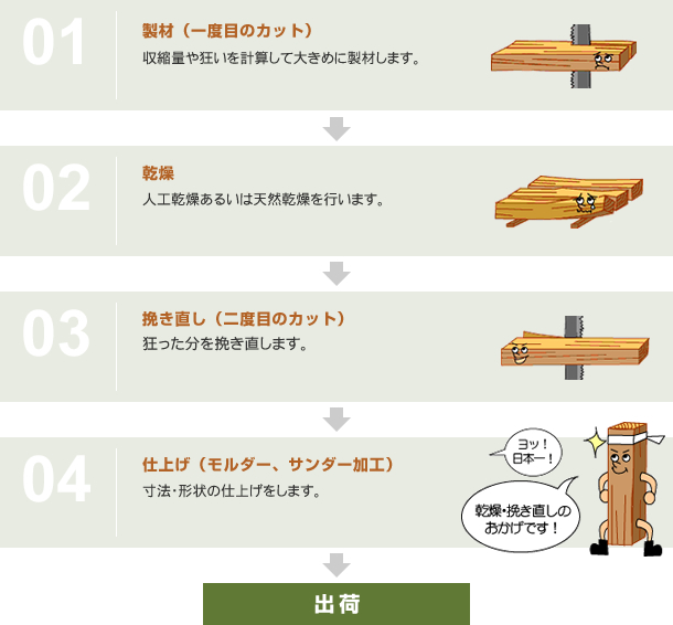 | 造作材(仕上げ) | 木口の短辺・長辺 75mm未満:-0~+1.0mm 75mm以上:-0~+1.5mm |