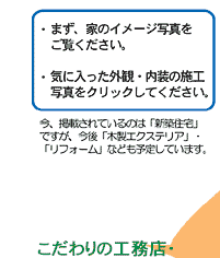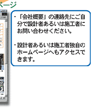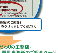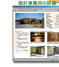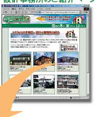このサイトは、いくつかの家づくりの実例を用意し、業者名からではなく、 あくまでも家そのものの情報からユーザーの皆さんに選択、比較していただ こうというものです。(工務店、設計事業所名や連絡先は、住所の特徴を説明するページ下段にあります。)