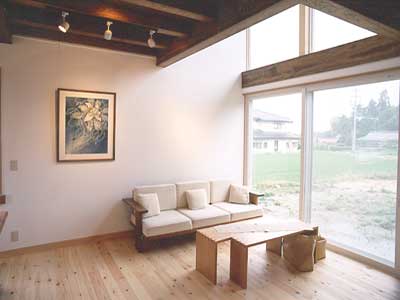 松の無垢板の床に寝そべって、太い梁のある天井を見上げると落ち着いた気分になれます。それは木の温もりを感じるからだけではなく、この家が確かな技術でしっかりと作られている、という安心感があるからだと思います。この家ができて3年目を迎えますが、床板や建具がだんだんいい色になってきました。この先、年を経るにつれて味わいを増していくのが楽しみです。